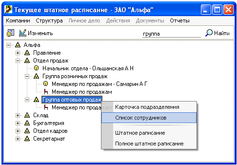 Завдяки графічному представленню організаційної структури у користувачів Фараона розвивається цілісний погляд на свою компанію і з'являється можливість проводити кадровий аналіз на будь-якому її рівні. Простіше кажучи, можна виконувати пошук або будувати звіти як по всій компанії відразу, так і по окремо взятих підрозділах. Наприклад, ви можете вибрати підрозділ і викликати список працюючих в ньому співробітників або викликати список відряджень співробітників цього підрозділу, а також побудувати штатний розклад (Рис. 1.1) або табель обліку робочого часу або звіт з розрахунком відпусток цього підрозділу або всієї компанії.