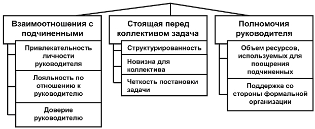 Ситуационная модель поведения руководителя, предложенная Фредом Фидлером в 1965 г. (см. рис. 4.9), исходит из того, что эффективность деятельности менеджера определяется возникающей ситуацией, которая характеризуется: