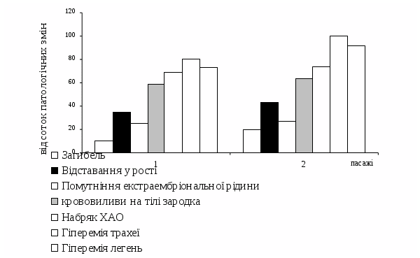 У другому пасажі виявляли макроскопічні зміни в ПЕ – це ураження багатьох систем органів: судинної (гіперемія та набряк ХАО), респіраторної ( гіперемія легень та трахеї) затримка росту, скрученість, помутніння екстраембріональної рідини з наявністю уратів і загибель ембріонів до 20% від загальної кількості, при цьому кількість уражень сягала 100%.