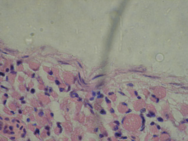 З метою оцінки впливу вакцинного штаму 1062 МПВ на трахею ПЕ проводили гістологічні дослідження. У кожної підгрупи відбирали зразки трахеї розміром 0,5–1,5 см, які фіксували в 10 %- му розчині формальдегіду. Гістологічні зрізи фарбували гематоксиліном та еозином [2] і після заключення в канадський бальзам проводили мікроскопію за допомогою апаратно-програмного комплексу, до складу якого входили: світловий мікроскоп Olympus C X 41; цифровий апарат Olympus C 5050 Z; фотоадаптер; плата цифрового кодування відеосигналів та комп'ютер.