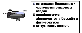 На вопрос анкеты, какие дополнительные услуги со стороны предприятия вам необходимы, многие хотели бы, чтобы со стороны предприятия уделялось внимание спортивно-оздоровительным мероприятиям (покупка абонементов в бассейн, в фитнес-клубы и т.д.), организовывались бесплатные или частично оплачиваемые обеды.