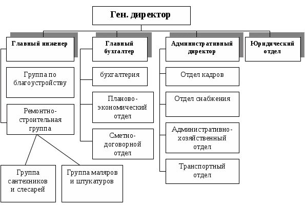 Подчиняясь генеральному директору, главный инженер руководит различными группами рабочих (группа по благоустройству, ремонтно-строительная группа). Ремонтно-строительная группа подразделяется на группу сантехников и слесарей, а также группу маляров и штукатуров. Организационная структура предприятия представлена на рисунке 1.