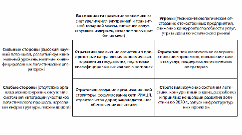 К сильным сторонам отнесем высокий научный потенциал, развитый функциональный уровень, наличие квалифицированных логистических операторов, перевозчиков, современных терминальных и складских комплексов.