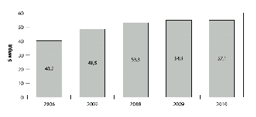 Рис. 1. Динамика роста объема рынка транспортно-логистических услуг в России, 2006–2010 гг.