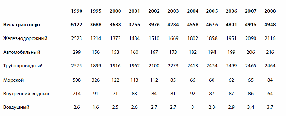 Сравнив данные таблиц за 2008 г., мы увидим, что общий грузооборот транспорта составляет 4948 млрд т/км, а оборот организаций транспорта — 4350,5 млрд руб. (5668,5 – – 1318). Таким образом, стоимость одного тоннокилометра составляет 0,88 руб. (4350,5 / 4948).