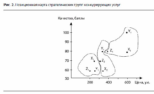 Таким образом, позиционная карта услуг детализирует и уточняет конкурентную позицию отдельных услуг в рамках ранее выделенных стратегических групп конкурентов.