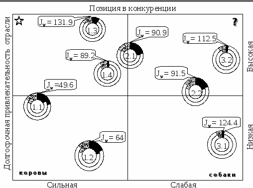 Исходным положением механизма анализа в данном случае является то, что соответствующая доля рынка непосредственно связана с процессом накопления наличности и прибыли. Вертикальная ось отражает привлекательность отрасли (размер, темпы роста отрасли, прибыльность, уровень конкуренции, а также политический, экономический, социальный и технологический факторы). Горизонтальная ось отражает позицию в конкуренции (комплексный показатель, включающий размер, темпы роста, долю рынка, прибыльность, имидж, сильные и слабые стороны).