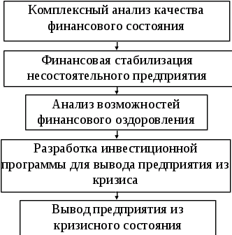 принцип этапности: процесс антикризисного управления состоит из нескольких последовательных этапов, состав и содержание которых зависит от степени состоятельности: анализ качества финансового состояния, финансовая стабилизация, анализ возможностей финансового оздоровления, разработка инвестиционной программы для вывода предприятия из кризиса, выведение предприятия из кризиса.