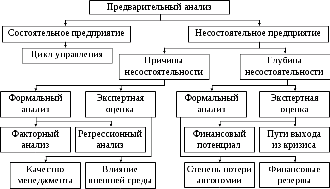 методика анализа причин кризисного состояния: предполагает использование иерархической системы, включающей экспертные оценки, ретроспективный анализ показателей, а также решение задачи оптимизации для поиска оптимальных путей вывода предприятия из кризиса;