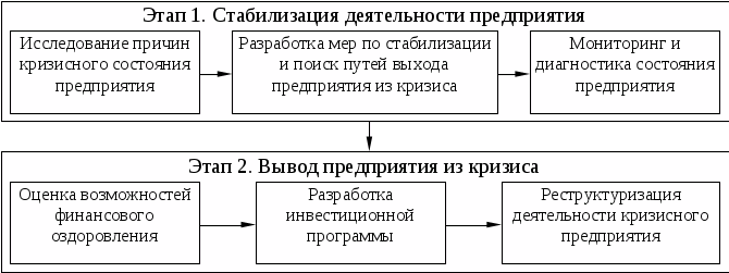 Отечественные экономисты трактуют это понятие по-разному. Например, В. И. Кошкин и С. Г. Беляев утверждают, что "антикризисное управление – совокупность форм и методов реализации антикризисный процедур применительно к конкретному предприятию-должнику" [121].