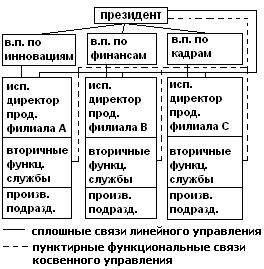 Цель создания продуктовой структуры - сконцентрировать такое же количество внимания, ресурсов, специалистов на производстве и сбыте каждого вида разнообразной продукции фирмы, сколько уделяет этой продукции фирма, выпускающая только один продукт.25 Для этого организуются продуктовые филиалы, полномочия по производству и сбыту продукции делегируются исполнительным директорам продуктовых филиалов. В каждом филиале организуются функциональные вторичные службы, которые непосредственно подчиняются исполнительному директору, а, с другой стороны, косвенно управляются функциональными первичными службами по вопросам их компетентности. Президент компании напрямую управляет вице-президентами и исполнительными директорами продуктовых филиалов.