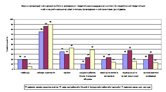 У регіонах використовуються як індивідуальні, так і групові форми організації методичної роботи. Організовано проведення семінарів-практикумів, тренінгів, науково-практичних конференцій, індивідуальних і групових консультацій, засідань районних (міських) методичних об'єднань, творчих і експертних груп.