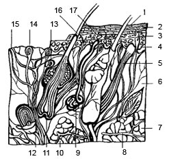 1 — роговичный слой;2 — чистый слой;3 — гранулезный слой;4 — базальный слой;5 — мышца, выпрямляющая сосочек;6 — дерма;7 — гиподерма;8 — артерия;9 — потовая железа;10 — жировая ткань;11 — волосяная луковица;12 — вена;13 — сальная железа;14 — тельце Краузе;15 — кожный сосочек;16 — волос;17 — потовая пора