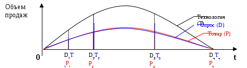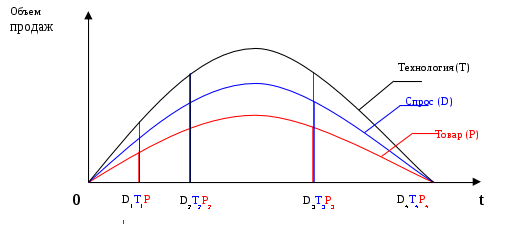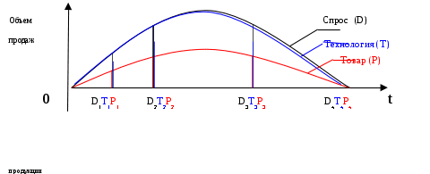 В этом случае кривые жизненных циклов спроса и товара совпадают и расположены под кривой жизненного цикла технологии.