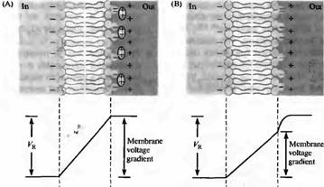 Рис. 1. Влияние поверхностного заряда на мембранный потенциал. (А) Нейтрализация двухвалентными катионами отрицательных зарядов в структуре мембраны. (В) Устранение экранирующих элементов (например, кальция) изменяет распределение заряда и градиент потенциалов на мембране, но не потенциал покоя. |