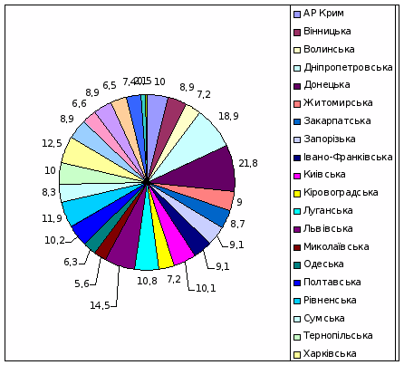 У територіальному розрізі найбільше інвалідів у Донецькій (9,4%), Дніпропетровській (6,4%), Харківській (6,1%) областях, а найменше – в Чернівецькій (1,6%), Тернопільській і Закарпатській – по 2%. Більше половини (53,1%) становлять інваліди другої групи, третьої групи – третину (33,8%), першої - 13,1% їх загальної чисельності. Розподіл інвалідів за причинами захворювання з роками практично не змінився: основна частка – інваліди праці (78,9%), інваліди з дитинства – 12,0% та 9,1% - інваліди з числа військовослужбовців (додаток А).