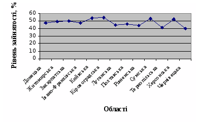 Середній рівень зайнятості сільського населення у 2002 р. в цілому по Україні склав 55,9%, але в більшості областей цей показник виявився нижчим (рис.2.2).