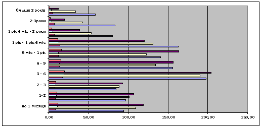 Щодо оцінки змін у складі безробітних за ознакою тривалості безробіття, то варто зауважити, що середня тривалість безробіття має тенденцію до скорочення: 2001р. - 11міс.; 2002р. - 9 міс.; 2003 р. - 8міс. В той же час простежується зростання числа незайнятих громадян з тривалістю безробіття до 3 місяців (30,8 проти 29,7% попереднього року); від 3 до 6 місяців (19,8 проти 18,9%) та від 6 місяців до 1 року (31,0 проти 25,6%), що наглядно відображено на рис.1.1