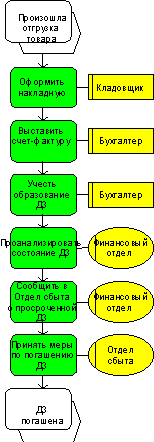 В показанном на рисунке 1 процессе управления дебиторской задолженностью участвуют несколько подразделений: бухгалтерия учитывает хозяйственные операции, финансовый отдел контролирует величину дебиторской задолженности, отдел сбыта принимает меры по ее сокращению. Типичные проблемы состоят в том, что, во-первых, оперативность получения информации по состоянию задолженности является недостаточной, а, во-вторых, подразделение, ответственное за возникновение этой задолженности, получает информацию последним. На предприятии ведется несколько параллельных систем учета отгрузок и дебиторской задолженности: бухгалтерская система, оперативная система учета отдела сбыта (Excel), система учета финансового отдела (Excel). Отдел сбыта вынужден вести свою внутреннюю систему учета, так как оперативность системы бухгалтерского учета его не устраивает. На следующем рисунке показан пример реорганизации бизнес-процесса.