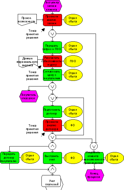 Поскольку все эти процедуры выполняются в различных подразделениях, то общее время анализа заказа клиента может составить 3-5 и более дней (в зависимости от специфики производства). Однако, при наличии необходимой информации, принимать решения по всем аспектам заказа мог бы отдел сбыта.