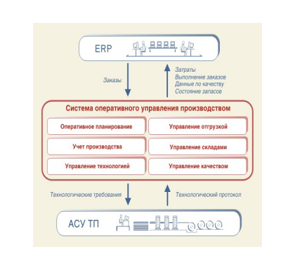 Взаимодействие с системой управления ресурсами предприятия (ERP) заключается в импорте укрупненного производственного плана и экспорте отчетности, преобразованной в совместимые форматы. Отчетность включает данные об израсходованных материально-технических ресурсах, отгрузке продукции, загрузке производственных мощностей, качестве продукции. Использование данной информации позволяет повысить эффективность управления ресурсами. В случае необходимости проводится разработка интерфейсов с любыми автоматизированными системами, функционирующими на предприятии (поддержки принятия решений, управления отношениями с клиентами и т.д.). Также отработано взаимодействие с системами управления производством смежных цехов и АСУ ТП различных типов и поколений.
