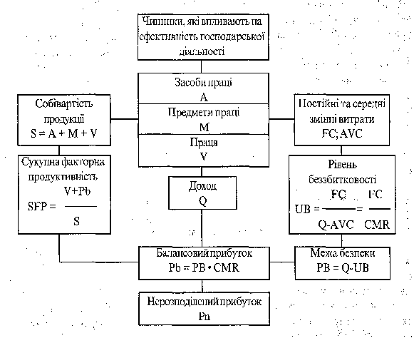 З показником рівня беззбитковості пов'язаний показник межі безпеки (різниця між виручкою від реалізації та рівнем беззбитковості). Як показує практика, показник межі безпеки оцінює: а) ефективність організації підприємницької структури, визначаючи припустимість змін прибутку; б) комерційну стійкість цієї структури Принциповим питанням як фінансово економічної діяльності, так і в господарській практиці є обгрунтування показника ефективності, який дозволяє без ускладнення рахунків пов'язати кількісні та якісні сторони діяльності при використанні даних обліку та звітності. Цим вимогам відповідає показник сукупної факторної продуктивності, який свідчить також про конкурентоспроможність підприємницької структури [20]. Оскільки різні види підприємницьких структур припускають неоднакове кількісне залучення праці та капіталу, то показник сукупної факторної продуктивності доцільно використовувати для оцінки ефективності конкретної організаційно-правової форми господарювання. Таким чинном, базою оцінки та порівняння результатів діяльності підприємницької структури окресленній організаційно правовіїй формі господарювання є відносно невелика кількість показників групи прибутковості, які залежать один від одного (див. рис 1).