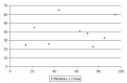 Выполните чертеж к заданию: в прямоугольной системе координат нанесите точки, в которых размещены магазины и распределительный центр.