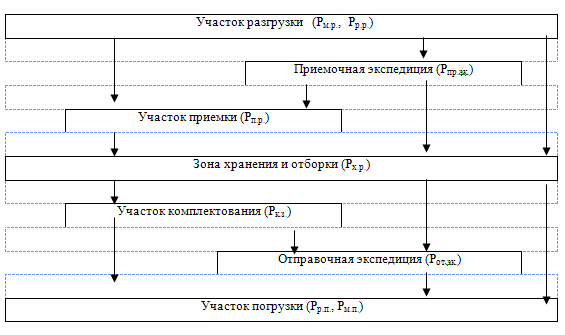 На следующем этапе весь входной поток товаров разделяется на три потока: поток товаров проходящий через приемочную экспедицию (Р>пр.эк>), поток товаров идущих через участок приемки (Р>п.р.1>) и товаров идущих сразу в зону хранения (Р>хр.1>).