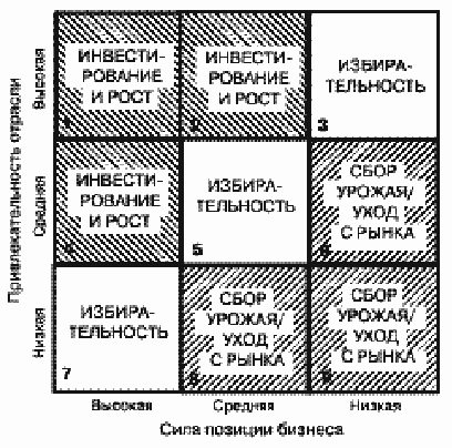 Индекс силы позиции определяется с учетом показателя относительной рыночной доли, динамики ее изменения, величины получаемой прибыли, имиджа, степени конкурентности, цены, качества продукта, эффективности сбыта, географических преимуществ рынка, эффективности работы сотрудников. Возможно взвешивание используемых показателей. Приняты три уровня градации данного индекса: сильная, средняя, слабая. Индекс привлекательности отрасли определяется с учетом размера и разнообразия рынков, скорости роста рынка, числа конкурентов, среднеотраслевой величины прибыли, цикличности спроса, структуры отраслевых затрат, ценовой политики, законодательства, трудовых ресурсов. Используются три уровня градации данного индекса: высокая, средняя и низкая. Пересечения линий, характеризующих различные уровни значений этих двух уровней, образуют решетку, которая делится на три зоны: зону, в которую организация должна инвестировать; зону, в которой организация должна поддерживать инвестиции на прежнем уровне; и зону, в которой надо получить максимально возможную прибыль, после чего ее следует покинуть.