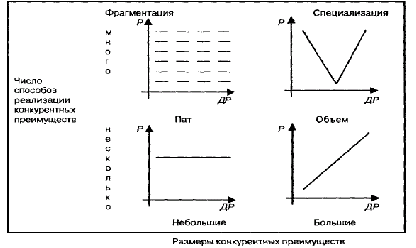 Размеры конкурентных преимуществ определяются возможностью использования эффекта масштаба, а число способов реализации конкурентных преимуществ определяет эффект дифференциации продукции: эффект тем сильнее, чем больше способов реализации конкурентных преимуществ.