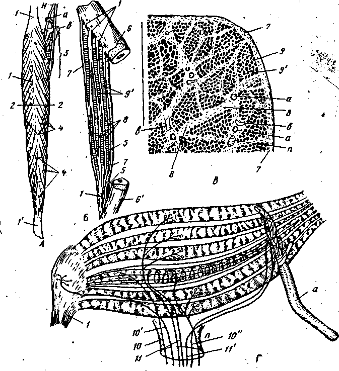 А — внешний вид двуперистой мышцы; В — схема продольного разреза многоперистой мышцы; В — поперечный разрез мышцы; Г — схема строения мышцы как органа (по Денни — Брауну); 1, 1’ — сухожилие мышц; 2 — анатомический поперечник мышечного брюшка; 3 — ворота мышцы с сосудисто-нервным пучком (а — артерия, в — вена, n — нерв); 4 — физиологический поперечник (суммарный); 5 — подсухожильная бурса; 6—6' — кости; 7 — наружный перимизий; 8 — внутренний перимизий; 9 — эндомизий; 9'— мышечные волокна; 10, 10', 10" — чувствительные нервные волокна (несут импульс от мышцы, сухожилий, сосудов); 11, 11' — двигательные нервные волокна (несут импульс в мышцы, сосуды)