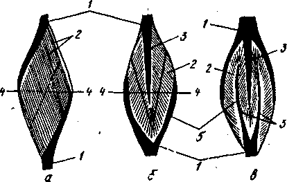 а — одноперистая; б — двуперистая; в — многоперистая; 1 — сухожилия мышц; 2 — пучки мышечных волокон; 3.— сухожильные прослойки; 4 — анатомический поперечник; 5 — физиологический поперечник