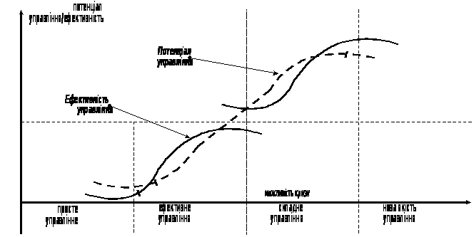 Розвиток управління повинен супроводжуватися підвищенням його ефективності. У свою чергу підвищення ефективності управління визначається ростом його потенціалу тобто можливістю позитивних змін, наявністю необхідних ресурсів і умов їхнього використання. Ефективність управління організацією – це швидке й адекватне реагування на зміну зовнішнього середовища, орієнтація на людину, побудову організації, безупинна інноваційна діяльність. Фактори ефективності не однакові для великої і малої організації, оскільки ці організації виконують різні місії в процесі задоволення потреб, у них різні цільові установи, їхні можливості непорівнянні.