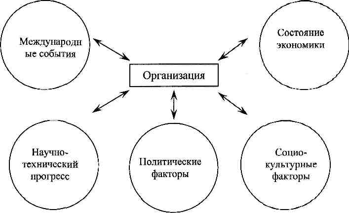 Внутренняя среда организации оказывает постоянное и самое непосредственное воздействие на функционирование организации. Угрозы и возможности, с которыми сталкивается организация, обычно можно выделить в семь компонент. Этими компонентами являются экономика, политика, рынок, технология, конкуренция, и социальное поведение.