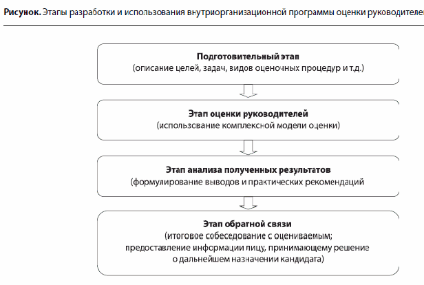 Необходимость использования комплексных моделей обусловливает применение практиками программного подхода к оценке и развитию управленческого персонала. Для каждой компании содержание программы сугубо индивидуально, однако процесс создания и использования внутриорганизационной программы оценки руководителей включает ряд общих этапов (см. рисунок).