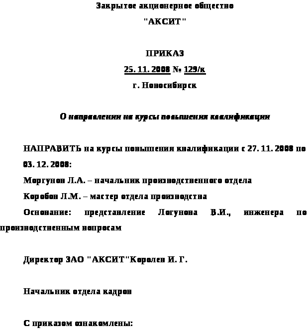 Отправить на курсы повышения квалификации на период установленный организацией проводящей курсы повышения квалификации |