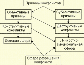 Итак, под конфликтами необходимо понимать конфликты, возникающие в системах социального взаимодействия субъектов и объектов управления. Источниками любых конфликтов в сфере управления являются противоречия, которые переходят в конфликт, как только для этого сформируются определенные условия и возможности, возникнет инцидент. Каждому виду и типу конфликтов соответствуют свои, специфические противоречия. Эти противоречия, в конечном счете, обусловлены структурой и содержанием социального взаимодействия – спецификой управления.