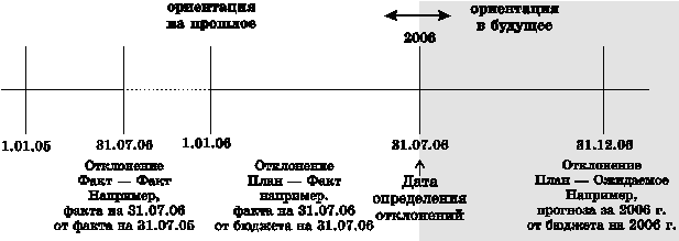 Ориентированные на временном горизонте отклонения (см. рис.10) используются контроллерами для анализа тенденций развития предприятия и его отдельных функциональных элементов. Зачастую целесообразным является сопоставления уже достигнутых результатов (факт) с фактическими результатами соответствующих предыдущих периодов (предыдущий месяц, аналогичный месяц прошлого года и т.д.). (см. табл.3, столбцы 2, 3, 10). Такое сравнение называют факт-факт. Сопоставление с процессами предыдущих периодов дает возможность аналитику использовать опыт уже реализованных мероприятий и видеть его реальную эффективность. Тем самым, анализ отклонений в прошлом помогает по возможности избежать отклонений в будущем.