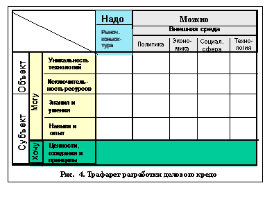 а). Уточнение социально значимой потребности рынка, которую компания собирается удовлетворять в результате коммерческой деятельности с возможным привлечением других участников внешней среды (партнеров, конкурентов, государственных и общественных организаций). Трафарет разработки делового кредо представляет собой матрицу анализа отношений конъюнктуры рынка (надо), возможностей компании (могу), устремленности компании (хочу) и ограничений внешней среды (можно) см. рис. 4.