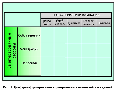 разработка корпоративных ценностей и ожиданий компании как компромисса интересов собственников, менеджеров и персонала в отношении перечня характеристик и соответствующих параметров, характеризующих эффективность бизнеса (см. рис. 3). Кроме того, формируются корпоративные принципы как система правовых, нравственных, этических, эстетических и прочих ограничений деятельности компании,