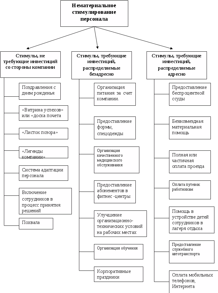 Стимулы, требующие инвестиций, распределяемые адресно. При построении этой части системы мотивации следует предварительно провести опрос или анкетирование персонала об их предпочтениях, о том, что каждого из них лично стимулировало бы работать еще лучше. Система в этой части может иметь два подраздела: этим может воспользоваться всякий, попавший в определенную ситуацию или выполняющий определенные требования и индивидуальные стимулы.