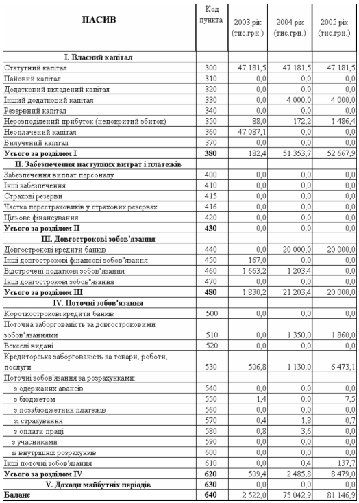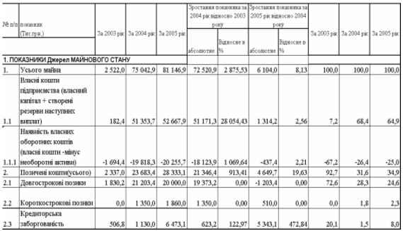 Таким чином, для 2003 2005 років для активів підприємства характерні процеси різкої зміни структури за рахунок введення в експлуатації нового цеха в процесі нарощення власного капітала при реорганізації підприємства в спільне підприємство та інвестуванням більш 47 млн.грн. іноземним інвестором на повне переобладнання цехів підприємства. Оборотний капітал підприємства на період освоєння виробництва поступово почав зростати з 3% до 6,5% валюти балансу, хоча в абсолютному значенні зріс майже в 13,5 раз (з 645 тис.грн.. до 8,191 млн.грн.).