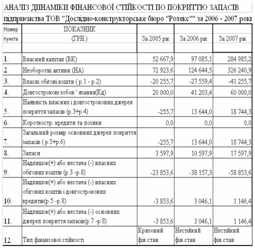 Звертає на себе увагу негативне значення показника власних оборотних коштів – 20,255 млн.грн., що фіксує вкладення довгострокового кредиту в 20 млн.грн. повністю в необоротні основні засоби. Таким чином єдиними джерелами оборотного капіталу є короткострокові кредити банків та кредиторська заборгованість, тобто ТОВ «Дослідноконструкторське бюро «РОТЕКС», повністю імобілізувавши джерела власного та довгострокового залученого кредиту в основні засоби, не має страхових запасів власного оборотного капіталу.
