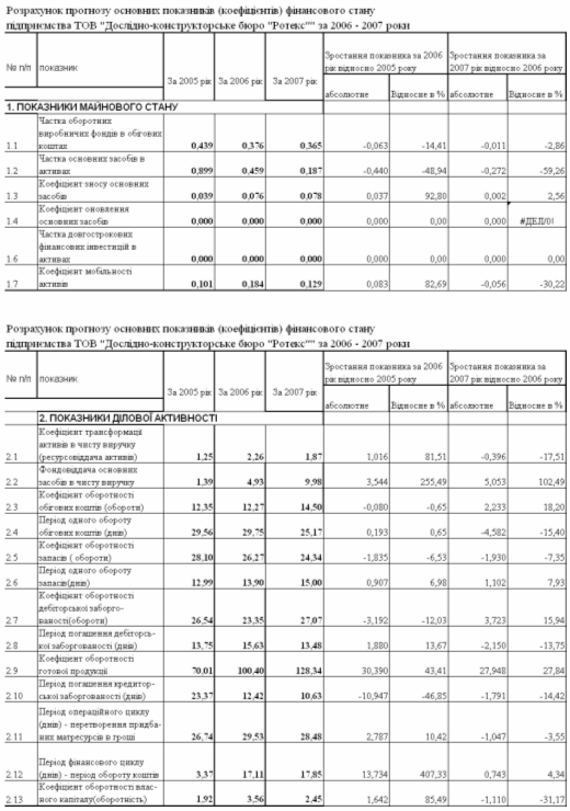 Аналіз результатів вторинної (коефіцієнтної) статистичної обробки балансових звітів та звітів про фінансові результати діяльності ТОВ «Дослідноконструкторське бюро «РОТЕКС» за 2003 –2005 роки показав: