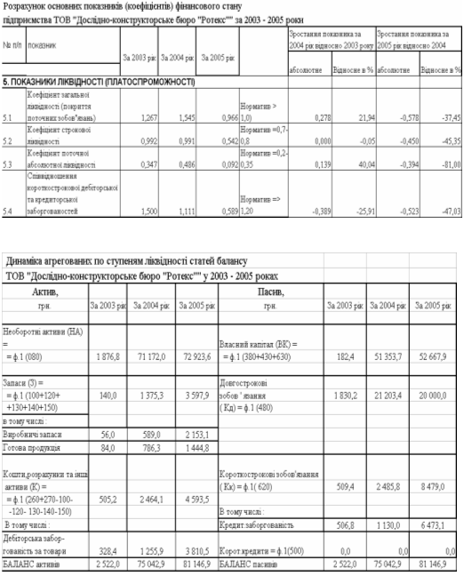 у 20032004 роках всі нормативи ліквідності балансу в ТОВ «Дослідноконструкторське бюро «РОТЕКС» знаходились вище нормативного діапазону стійкого ліквідного стану підприємства на 2030%, що свідчило про стійкий характер платоспроможності підприємства;