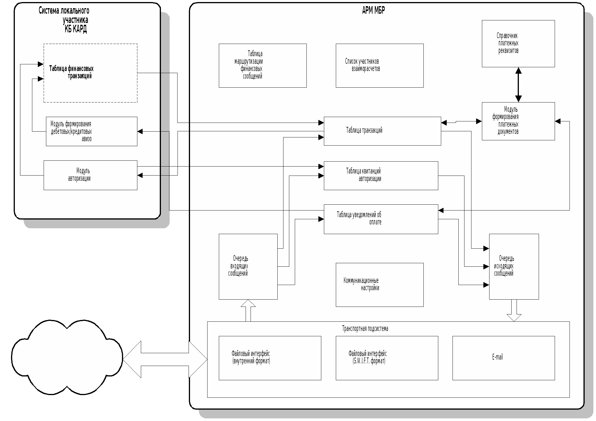 В частном случае, взаиморасчеты всех банков-участников карточной платежной системы могут строиться по принципу “каждый с каждым”. Схема организации взаимодействия банков при этом аналогична схеме взаимодействия Головных Филиалов по предыдущей схеме, АРМ МБР каждого банка обеспечивает процедуры обмена сообщениями с другими банками, строит платежные поручения (или требования), однако никаких операций по взаиморасчетам между нижестоящими участниками не выполняет, поскольку нижестоящие участники отсутствуют.
