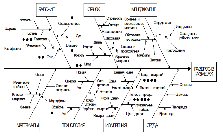 При рассмотрении схемы на уровне первичных стрелок факторов во многих реальных ситуациях можно воспользоваться предложенным самим Исикавой правилом «шести М» (правило расширено). Оно состоит в том, что в общем случае существуют следующие шесть возможных причин тех или иных результатов: материал (material), оборудование (machine), измерение (measurement), метод (method), люди (man), менеджмент (management). Все эти слова по-английски начинаются с буквы «М», откуда и пошло название данного правила. Разумеется, могут быть и другие факторы, более точно характеризующие объект анализа. Главное – необходимо обеспечить правильную соподчиненность и взаимозависимость факторов, а также четкое оформление схемы, чтобы она хорошо смотрелась и легко читалась. Поэтому, независимо от наклона каждого фактора, его наименование всегда располагают в горизонтальном положении, параллельно центральной оси.