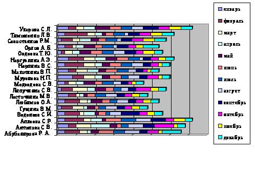 На основании отчетов риэлторов за 2007 г. составим сводную таблицу количества сделок каждого сотрудника 9 без ведущих специалистов) и с помощью графического метода определим лидера и аутсайдера (табл. 1).
