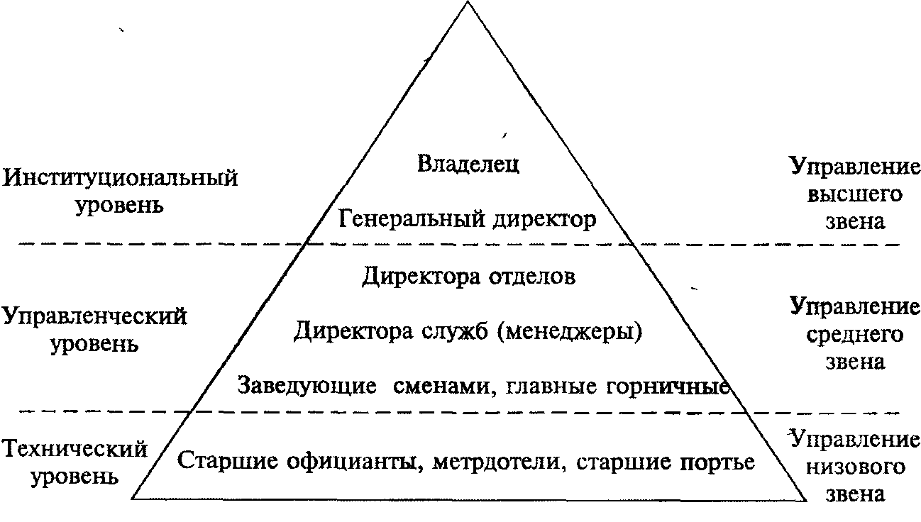 Под уровнем управления понимают совокупность звеньев управления, занимающих определенную ступень в системе управления гостиницей. Ступени управления находятся в вертикальной зависимости и подчиняются друг другу: менеджеры более высокой ступени управления принимают решения, которые конкретизируются и доводятся до нижестоящих звеньев.