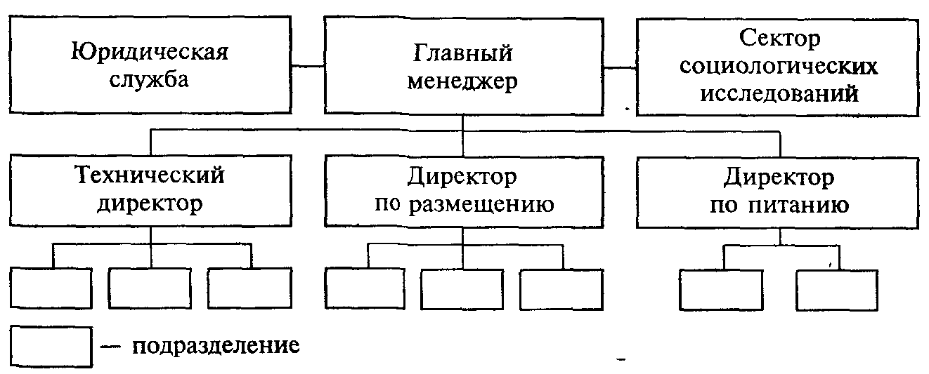 Линейная организационная структура управления. Линейные связи в гостинице отражают движение управленческих решений и информации, исходящих от так называемого линейного менеджера, то есть лица, полностью отвечающего за деятельность гостиницы (как правило, небольшой) или ее структурных подразделений (в крупной). Это одна из простейших организационных структур управления.